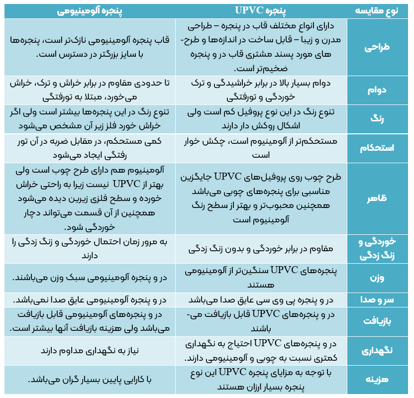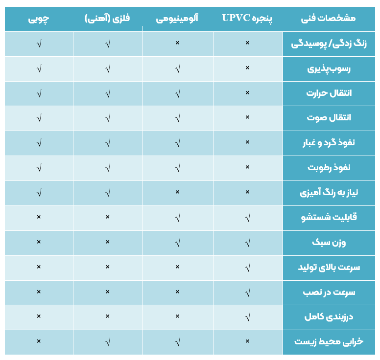 جدول مقایسه پنجره های یو پی وی سی با پنجره های آلومینیومی